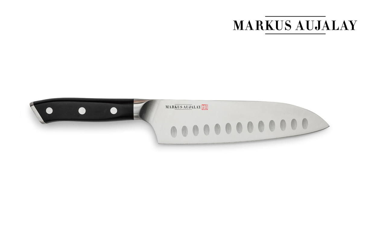 Markus Aujalay japanska kockkniv classic i stilren design, noga utvald för finsmakare av Markus Aujalay. Vass kniv som gör matlagningen roligare och enklare, en perfekt kniv för varje tillfälle. Satinpolerade knivblad av högsta kvalitet. Svart greppvänligt handtag och Markus Aujalays logo / tecken snyggt etsad / tryckt på bladet. Storlek 30cm.
