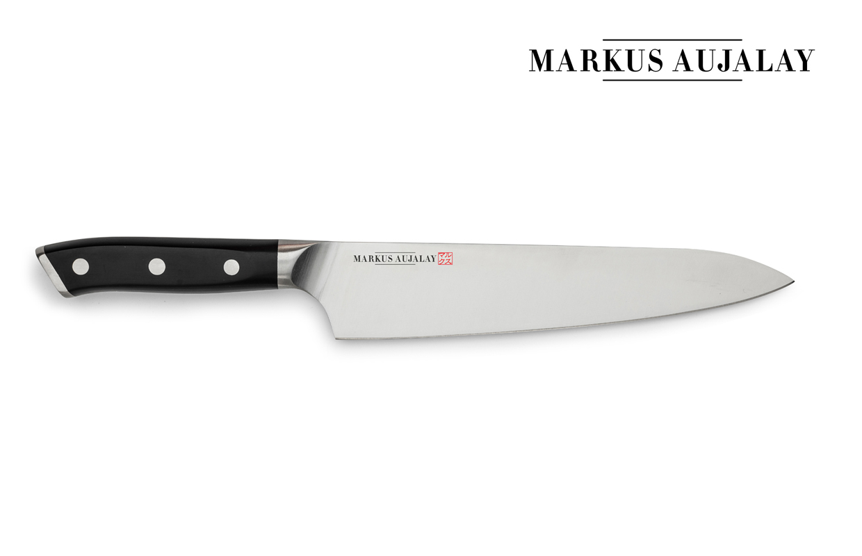 Markus Aujalays kockkniv classic i stilren design, noga utvald för finsmakare av Markus Aujalay. Vass kniv som gör matlagningen roligare och enklare, en perfekt kniv för varje tillfälle. Satinpolerade knivblad av högsta kvalitet. Svart greppvänligt handtag och Markus Aujalays logo / tecken snyggt etsad / tryckt på bladet. Storlek 32cm.