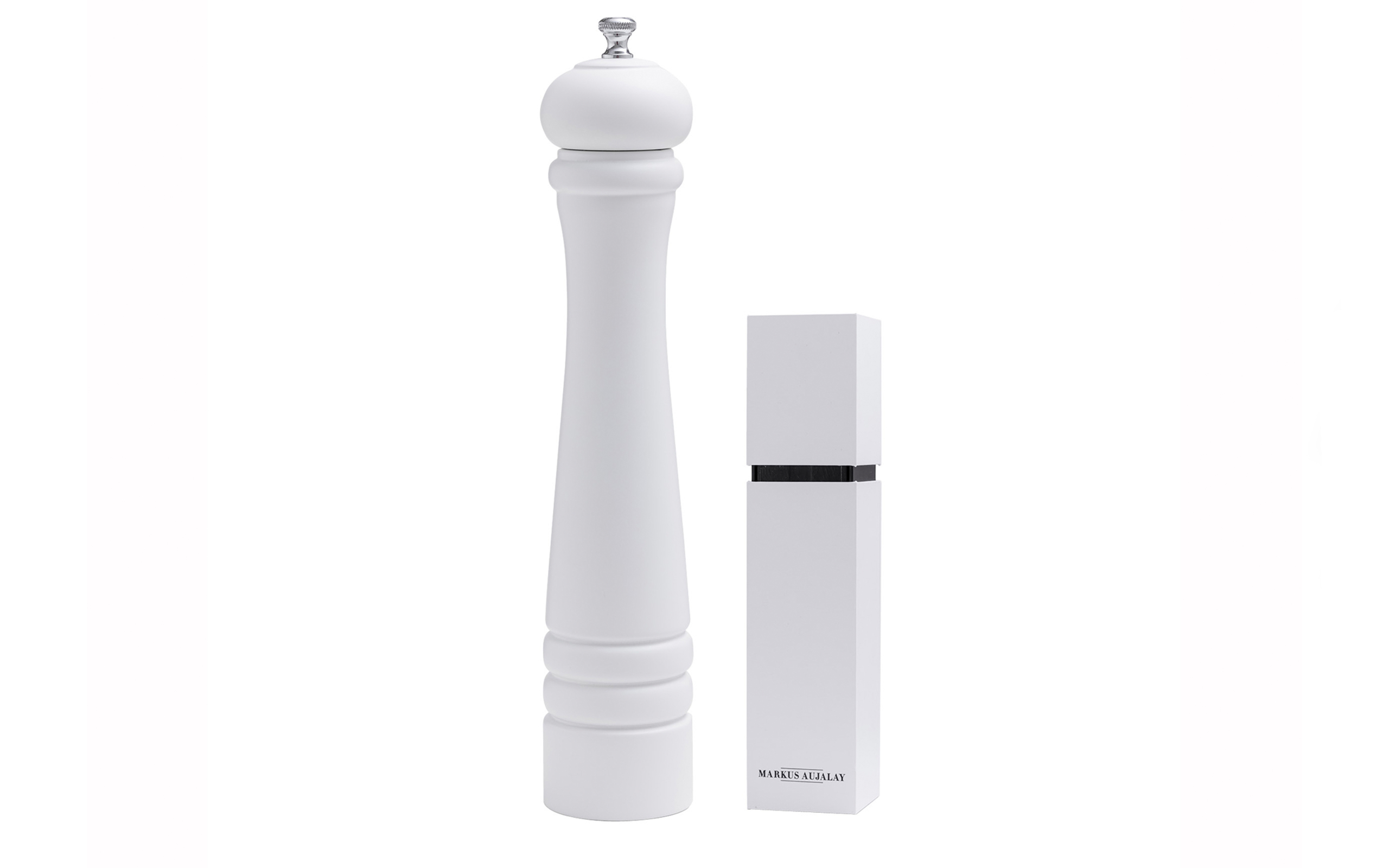 Exklusiv saltkvarn som är hela 32 cm i matt finish. Kvarnens verk är av högsta kvalitet i keramik. Markus Aujalays logo i botten.