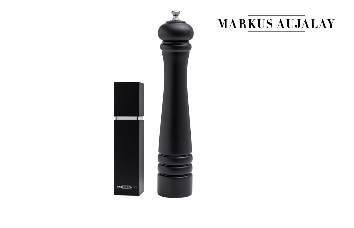 Exklusiv pepparkvarn som är hela 32 cm i matt finish. Pepparkvarnens verk är av högsta kvalitet i carbon stål. Markus Aujalays logo i botten.