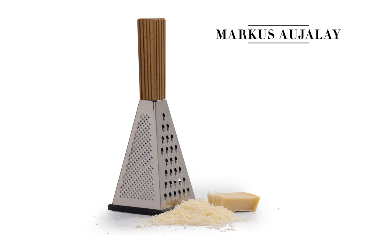 Rivjärn med fyra olika rivytor och ett greppvänligt handtag i acaciaträ. Rivjärnet långa handtag gör att du lätt kan hålla den i handen samt med fördel ställa den direkt på bordet där man själv kan riva parmesanosten. Markus Aujalays logo på handtaget. Längd 30 cm.