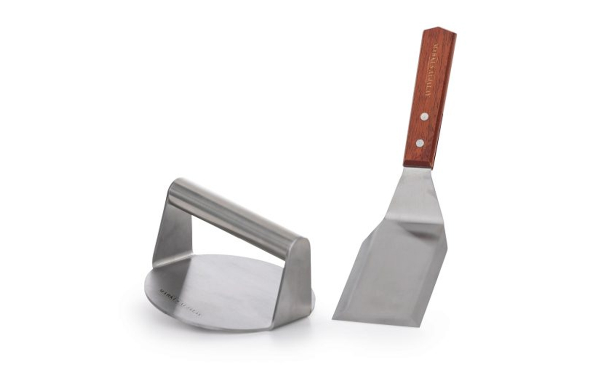Komplett set för att göra perfekta burgare, ett smashjärn som är 14cm i diameter och med bra tyngd (500gr). Kommer tillsammans med en stekspade som har fasade kanter och är 30cm lång.