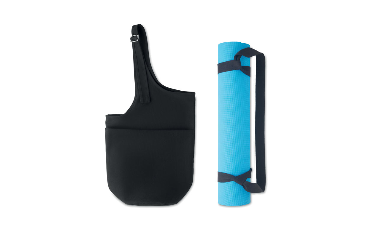 Träningsset bestående av yoga matta (4 mm) tjock och träningsband. Kommer i kraftig svart canvasväska med långa handtag i 340 gr/m² .